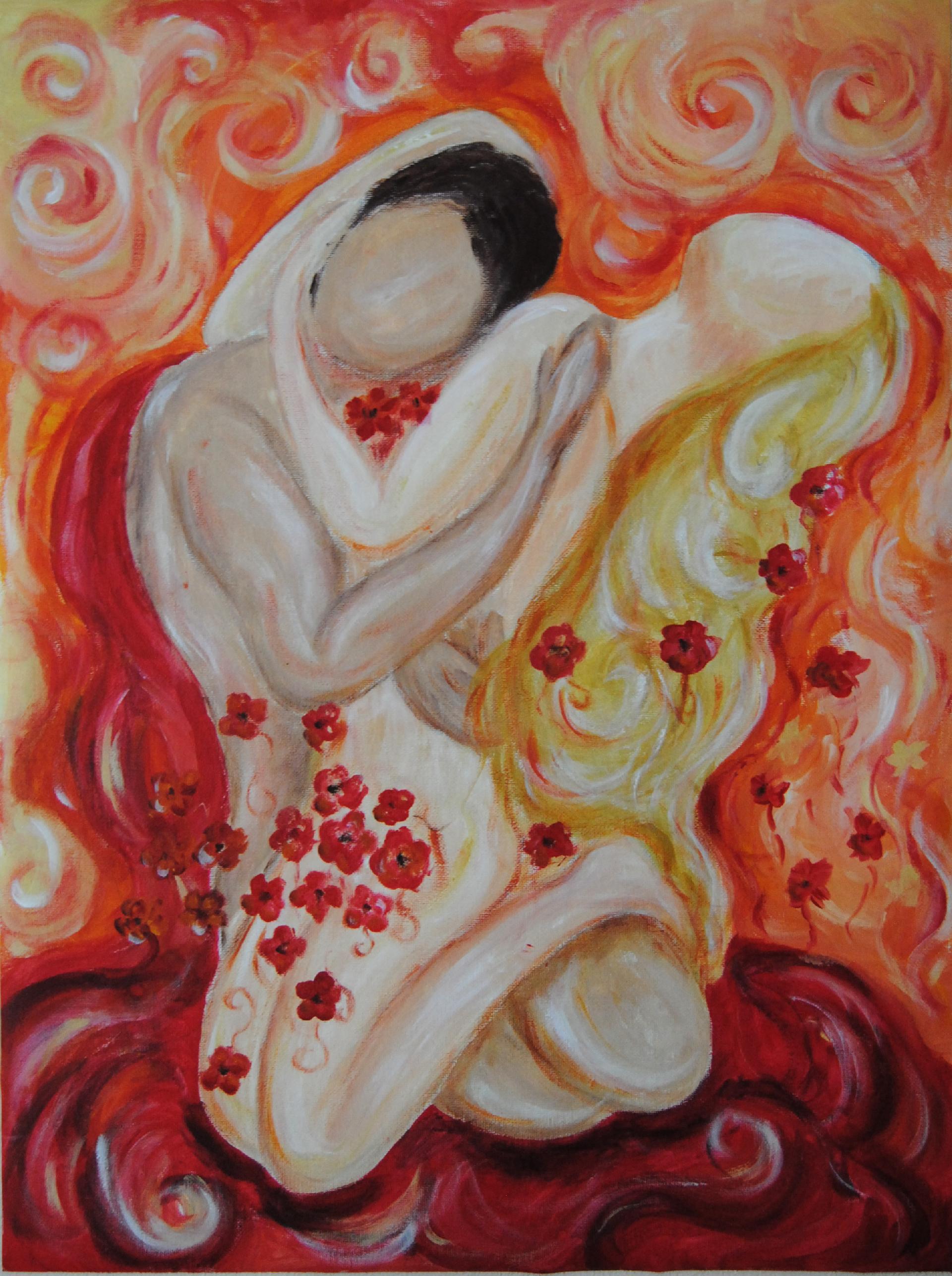 Una coppia di amanti, assorta in un intenso abbraccio comunica ad un livello interiore ed emozionale. I corpi esprimono sentimenti profondi tramite la morbidezza e l'unione delle forme in una ricerca di equilibrio con le porzioni astratte dello sfondo, caratterizzato da motivi a spirale acrilico su tela