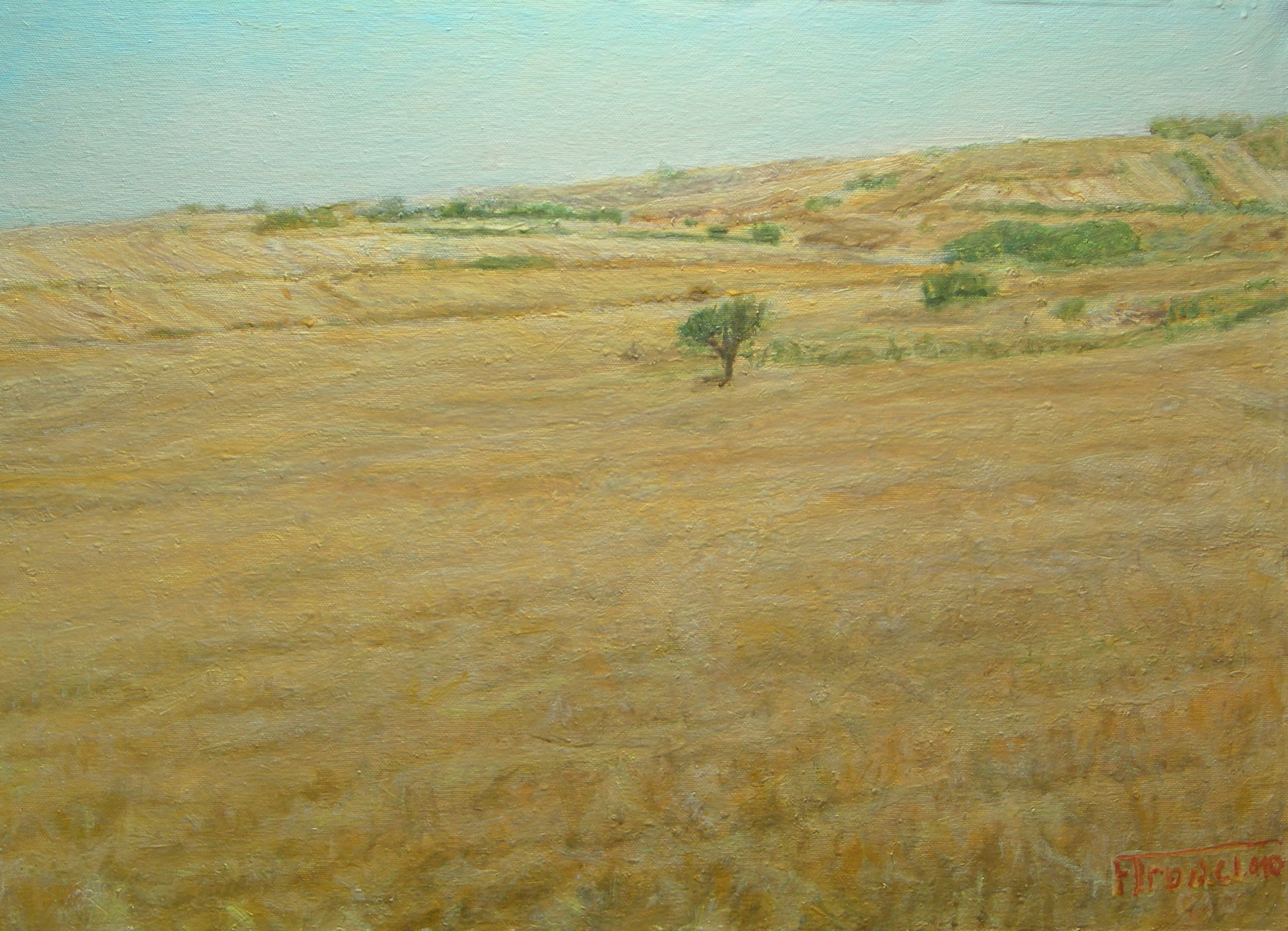 Olio su tela 70x50 -Tipica rappresentazione della campagna basso-campidanese. Sul piano pittorico è evidenziabile l'impostazione dei piani differenziati terra e cielo che conferiscono all'opera il senso dello spazio e sul piano cromatico un monocolore giocato su varie sfumature.