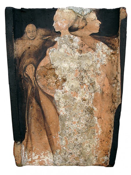 Tecnica mista: matita, inchiostro, tempera bianca e nera con interventi di graffito su vecchio embrice in terracotta.
